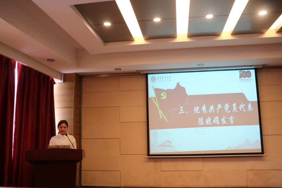 陈晓娟作为“优秀共产党员”代表说道抗击新冠肺炎疫情中的先锋模范们用实际行动不断激励着自己,学习他们的奋勇向前不畏牺牲、学习他们的无私奉献敢为人先,作为一名共产党员要牢记初心和使命,践行华农学子勤读立耕立己达人的精神,同时作为食科人要不断学习提高创新能力,做创新型人才,对党衷心、对人热心、做事耐心。