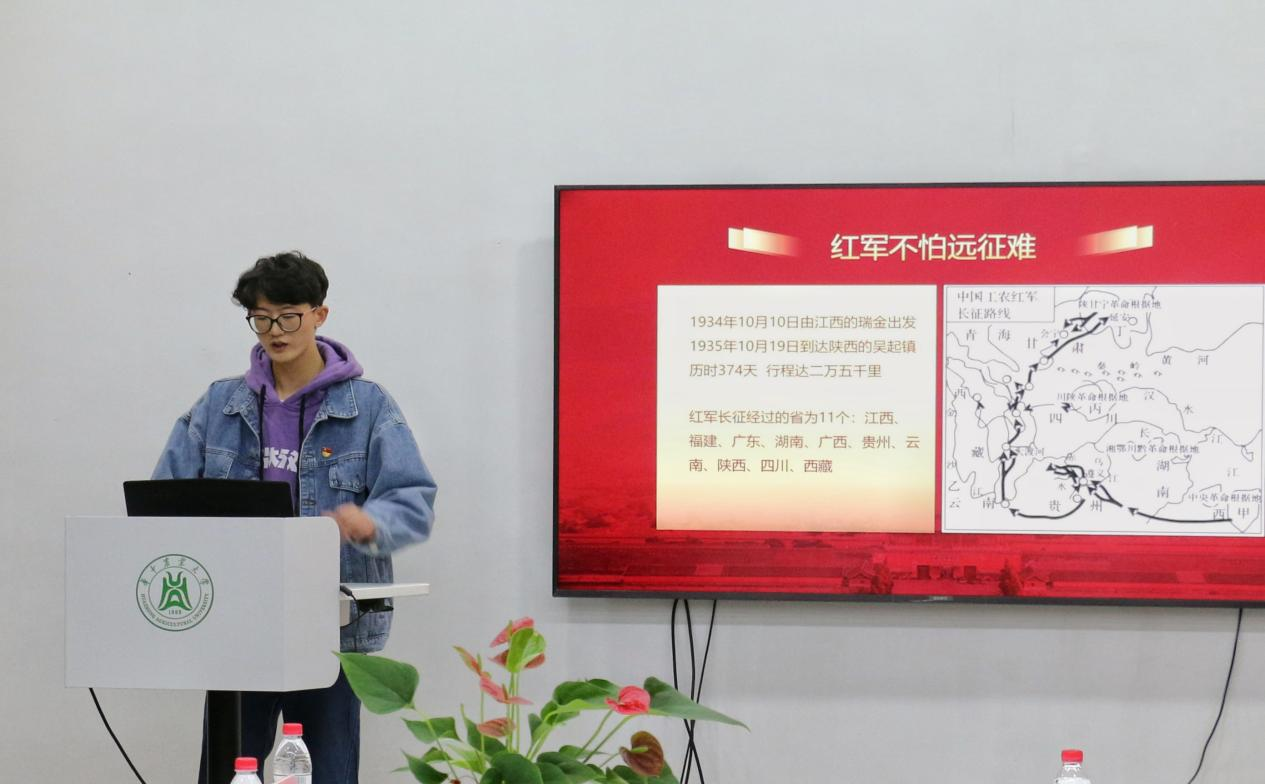“仰望青藏话沧桑,长征途中红色粮”青稞背后的长征故事被食研2105班罗伊婷娓娓道来。青稞是红色军粮、是救命稻草,她通过小小的青稞带给我们大大的感动。“百草汤”是什么滋补膳食吗?不,所谓的“百草汤”就是宰牛里把牛胃里没有完全消化的草取出来,进行再加工的一道浓汤,博士生黄云飞用白草汤带我们忆苦思甜,感悟两万五千里长征路上的长征精神。一根皮带系长征,食研2106班应天昊定格长征艰难险阻,激励我们传承不屈精神。