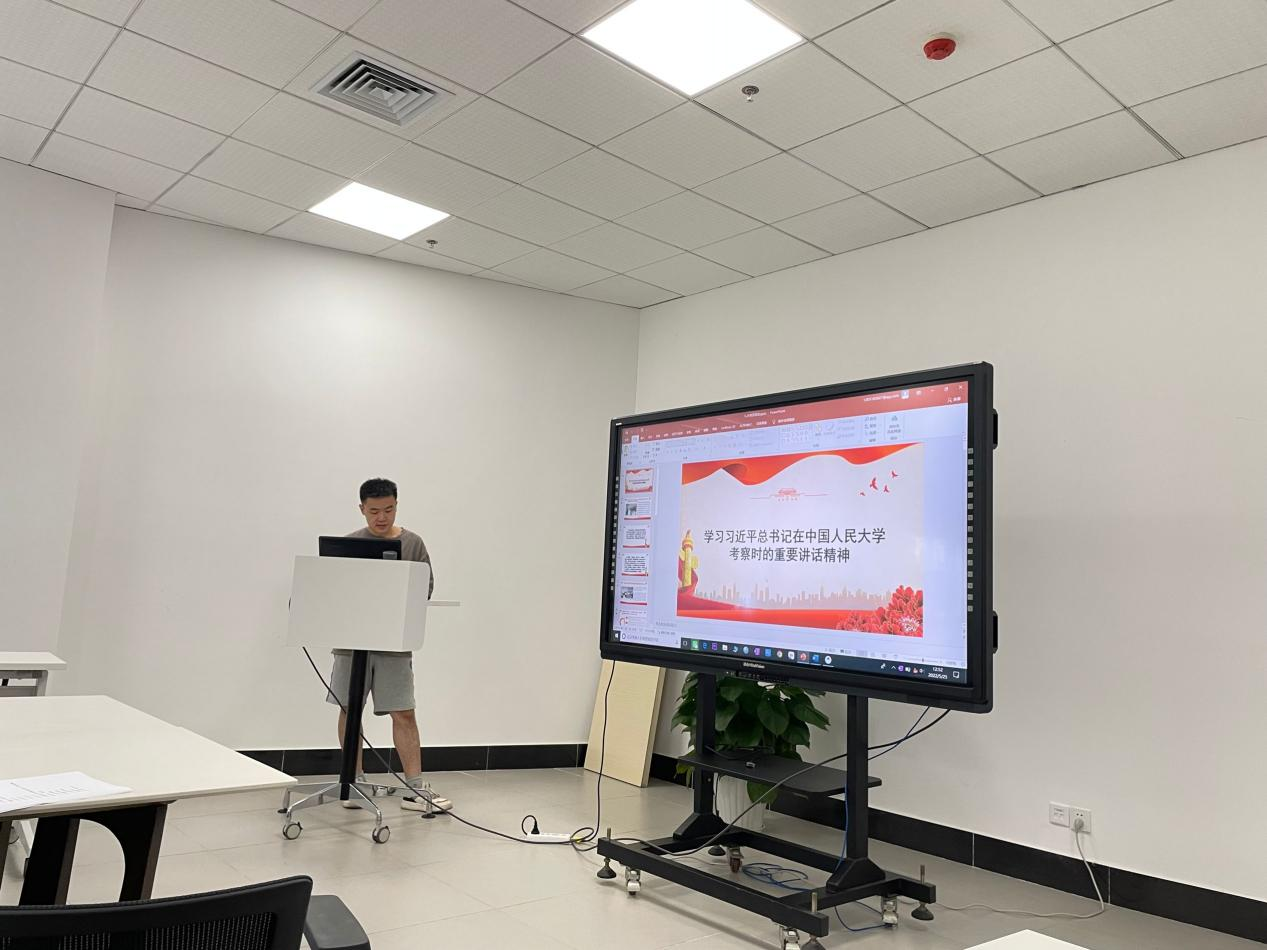 支部书记刘小涢先带领大家回顾习近平总书记去到中国人民大学的相关新闻信息以及发表的重要讲话。他谈到:“习近平总书记的重要讲话不仅对广大教育者有着指向性的作用,习近平总书记更是青年人路上的领路人。我们应当时刻牢记自己身上的责任,要把自己今天的学业、明天的事业同国家的需要、人民的需要紧密联系起来,肩负起建设社会主义现代化强国、实现中华民族伟大复兴的历史使命。”