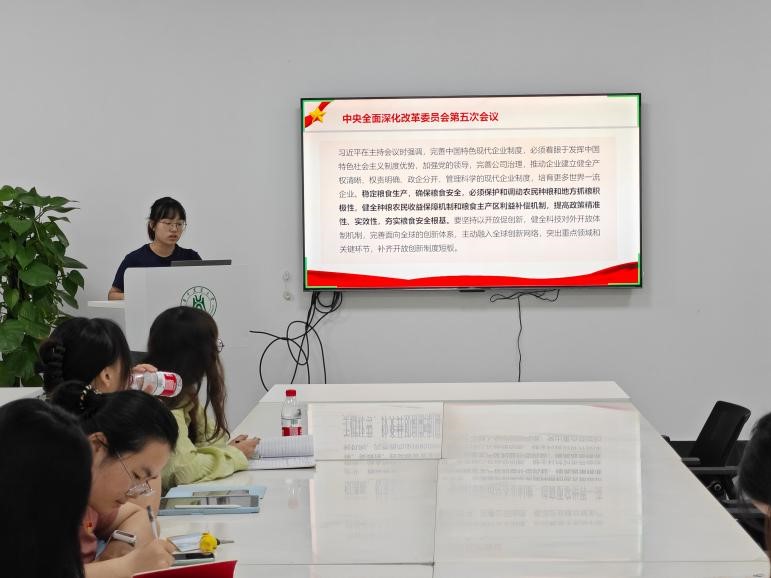 而后,曲佳带领党员们学习中央全面深化改革委员会员第五次会议的重要指示精神,对于推进民营企业建立现代企业制度,健全种粮农民收益保障机制和粮食主产区利益补偿机制以及建设具有全球竞争力的科技创新开放环境等方面的内容着重进行了讲解。