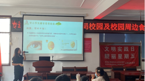 宣讲人莫娇同学从“校园周边的事物有哪些”为切入口,介绍了校园周边常见食品主要有路边摊的小吃,小卖部售卖的劣质薯条、辣条、糖果等,这些食品因周边环境脏乱差,食品制作来源不可靠,并且受到路边灰尘细菌的污染,均有安全卫生隐患,大大增加了饮食安全的风险。此外,也向小朋友们详细介绍了如果长期大量食用饼干、薯片、方便面等高脂肪高热量的食物会造成肥胖、龋齿、营养不良、胃肠道疾病及食欲下降等问题。