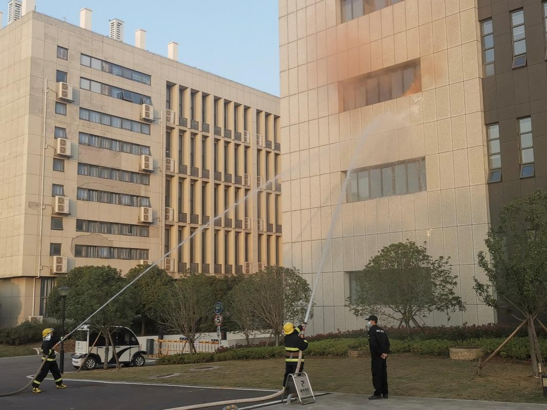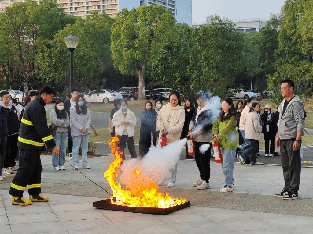 安全讲座结束后,师生开展实战演练。本次实战重点演练实验室或大楼内突发火灾事故时,师生如何扑灭初起火灾并快速疏散。演习活动以实验室为着火模拟点,楼内响起尖利的火灾警报声,各实验室参演师生听到警报声后迅速反应,在各楼层安全出口安全员的引导下迅速向楼外有序撤离。待大楼内师生按照设定的疏散路线撤离至安全区域后,建安部联合消防救援大队举行灭火技能实战操作演练,消防员向同学们详细介绍了灭火原理、灭火器各部件的功能及灭火要领,悉心指导同学们使用灭火器,150余名同学参与灭火器实操演练。